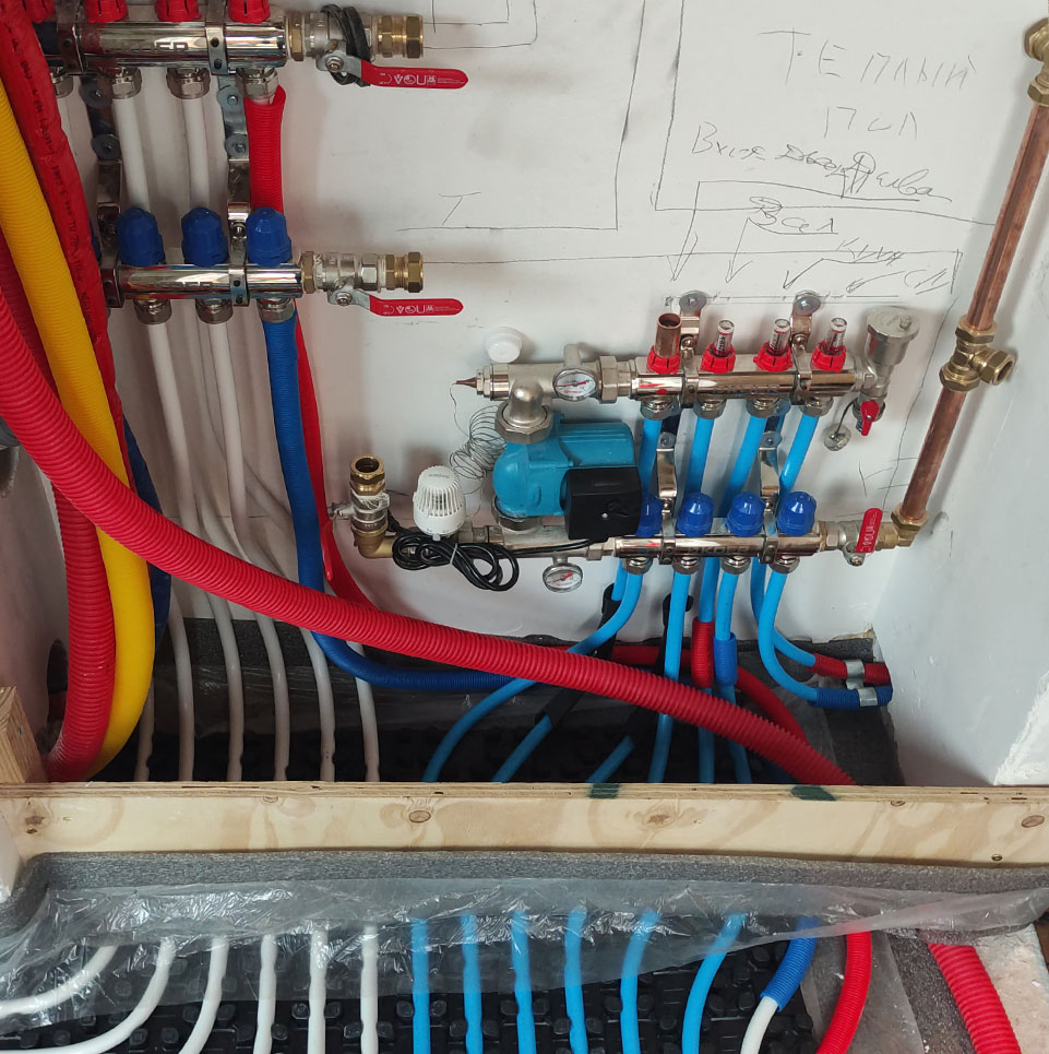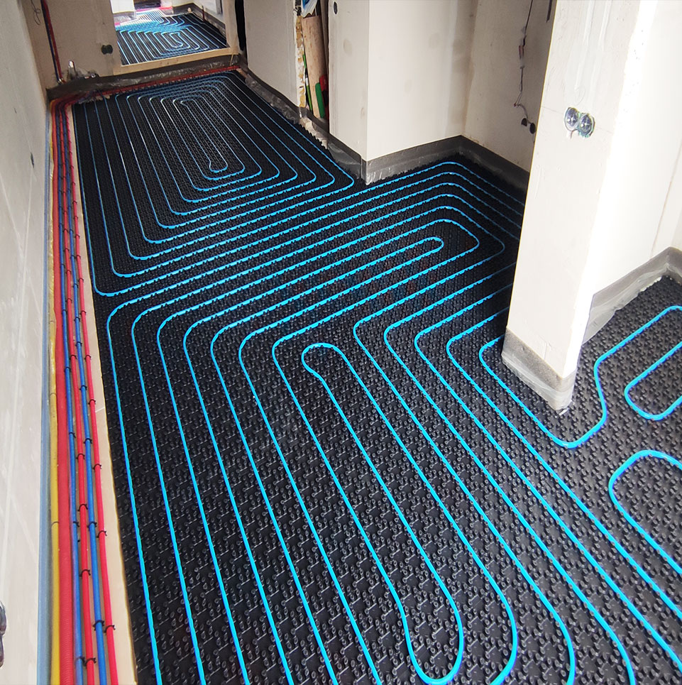 Installatie en aansluiting van vloerverwarming (met verdeler en pomp), afstellen van temperatuurzones en testen van de werking.