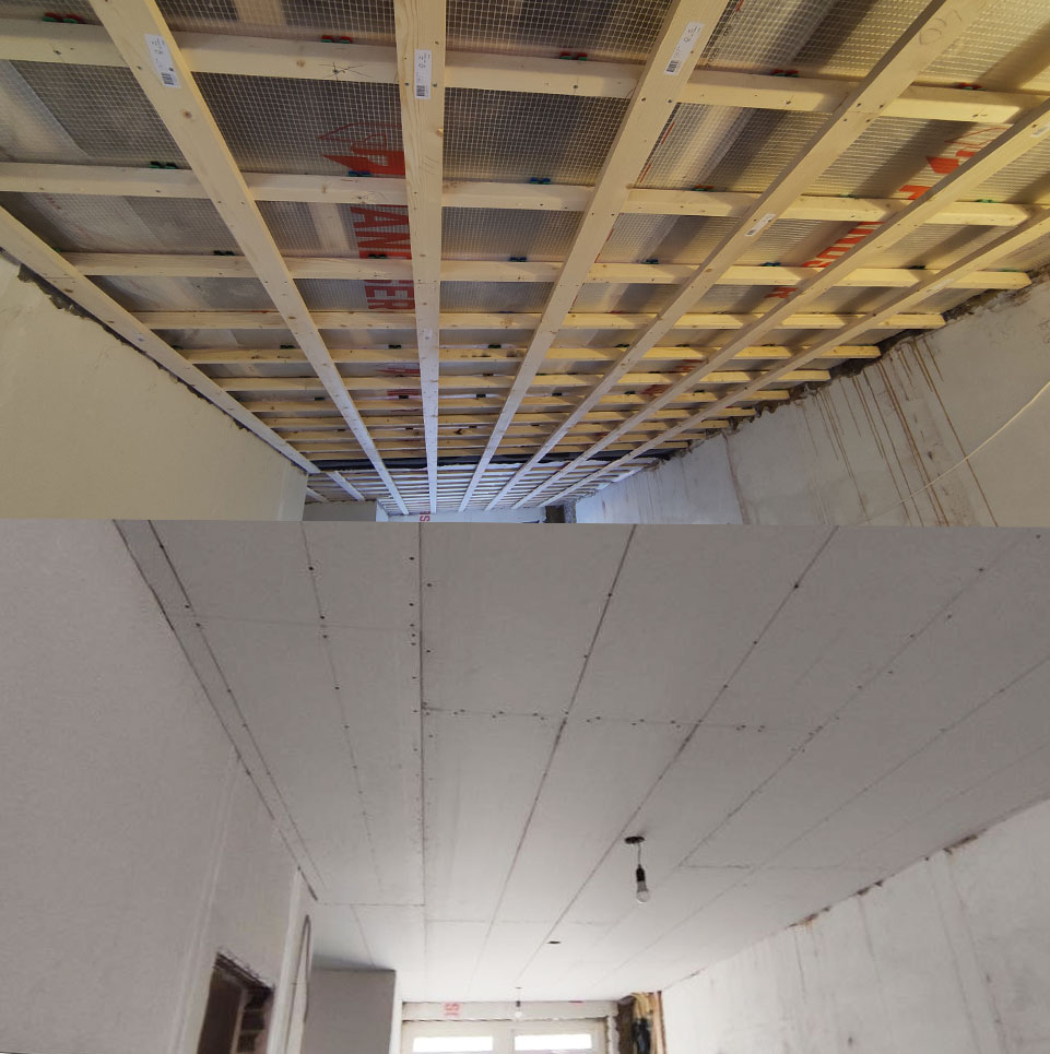 Het voorbereiden van het houten frame en het plaatsen van het gipsplaatplafond. (Almelo)